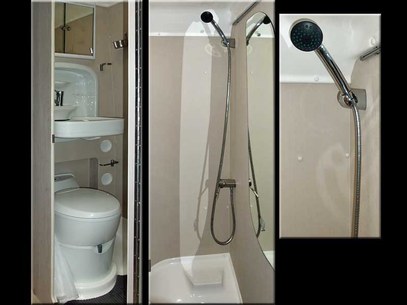 Compact rear washroom with a shower, sink, wc, mirrored cabinet & mirror.