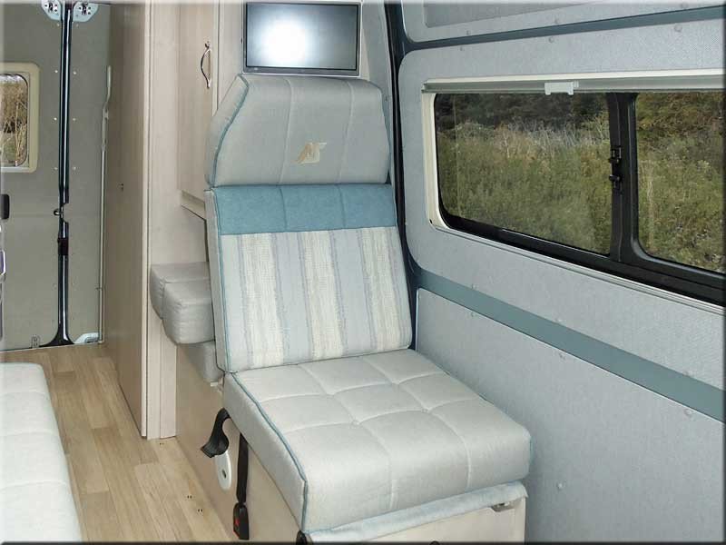 Central area with a side facing sofa, forward facing seat with seat belt and a removable table.