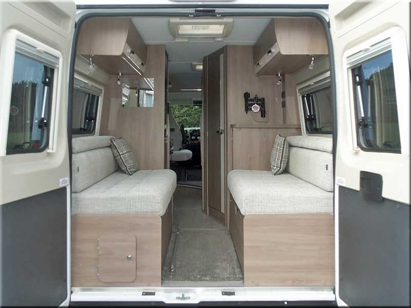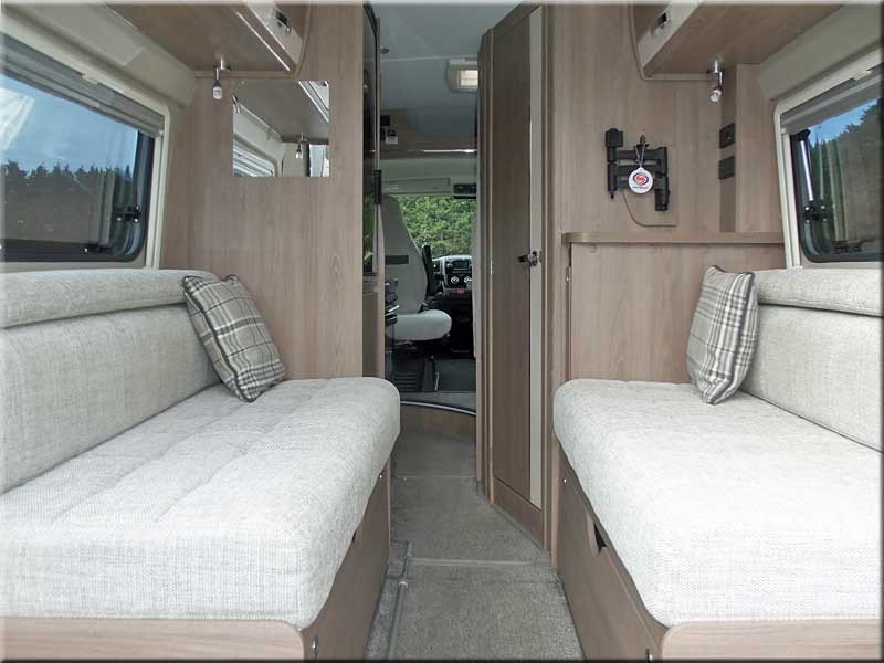 Rear lounge with 2 side facing sofas & removable table.
