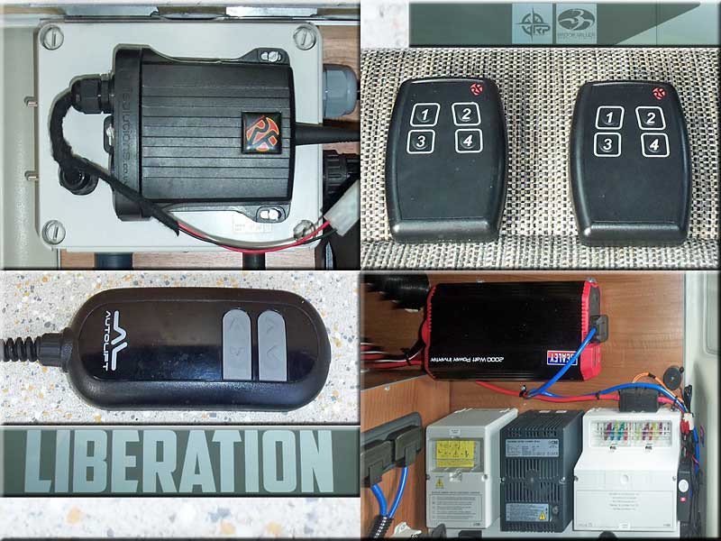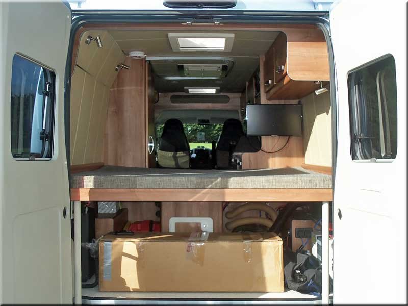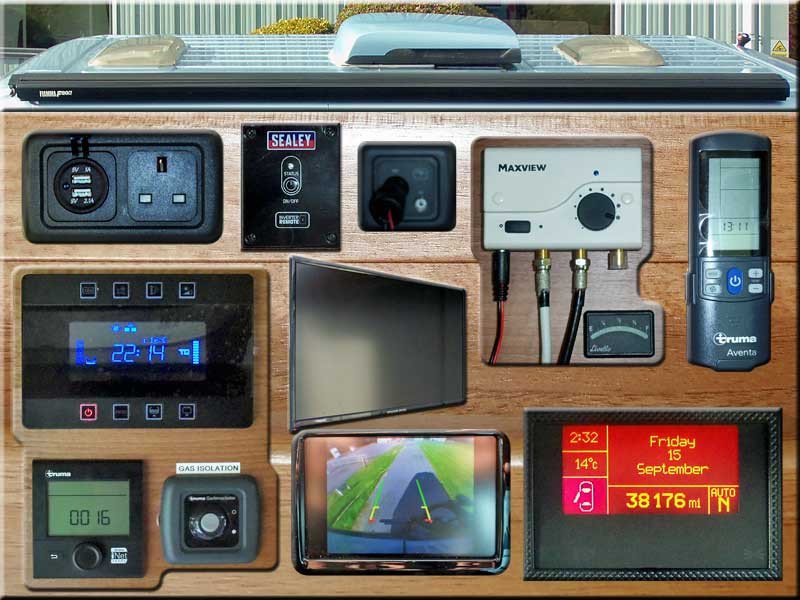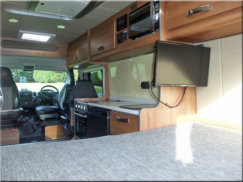 Truma Aventa Roof Air-Con, heating, Spot & LED strip & dual colour ceiling lights, Tv point & Tv on bracket on wall.