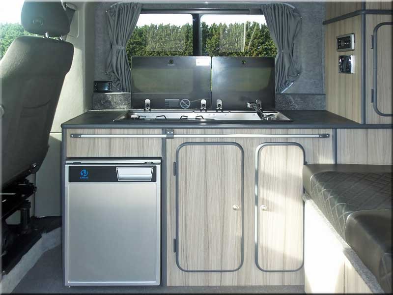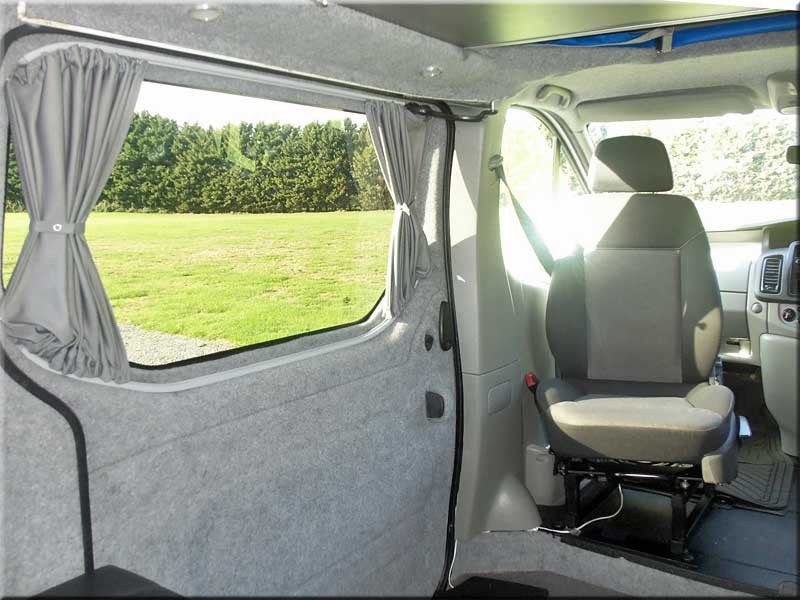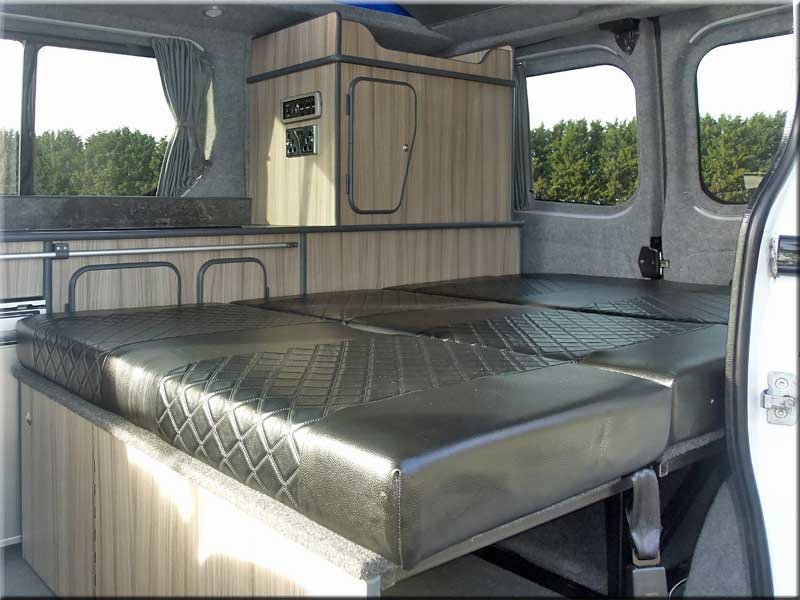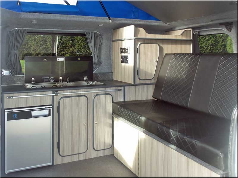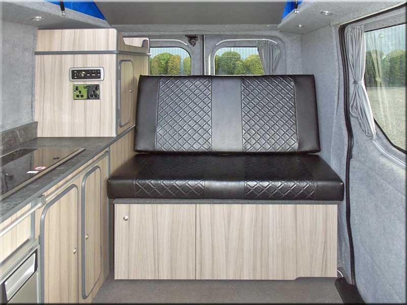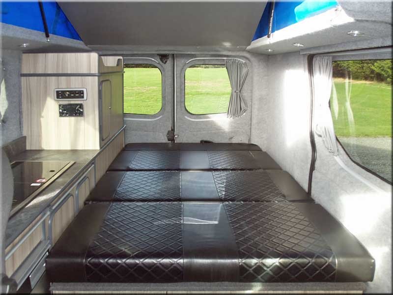 Side and rear access doors & tinted windows, curtains, lino flooring, ample storage, imitiation black leather upholstery.