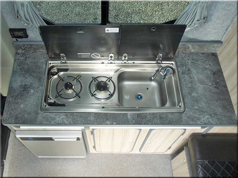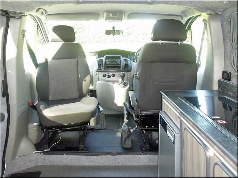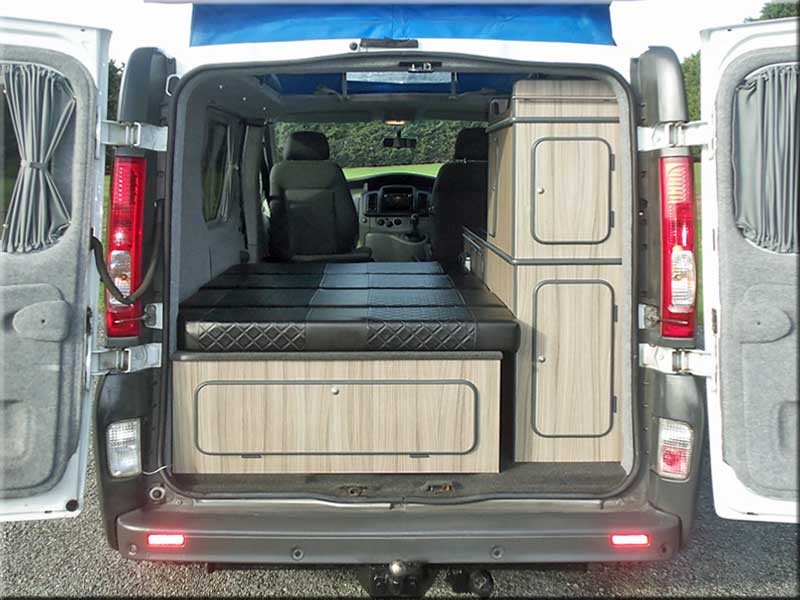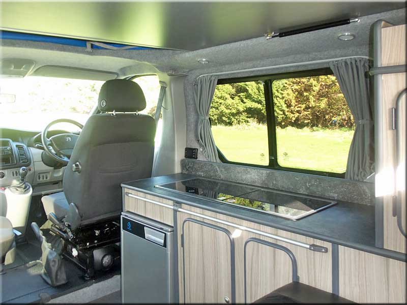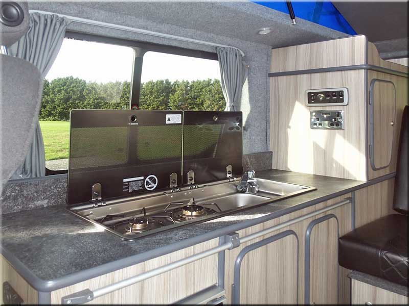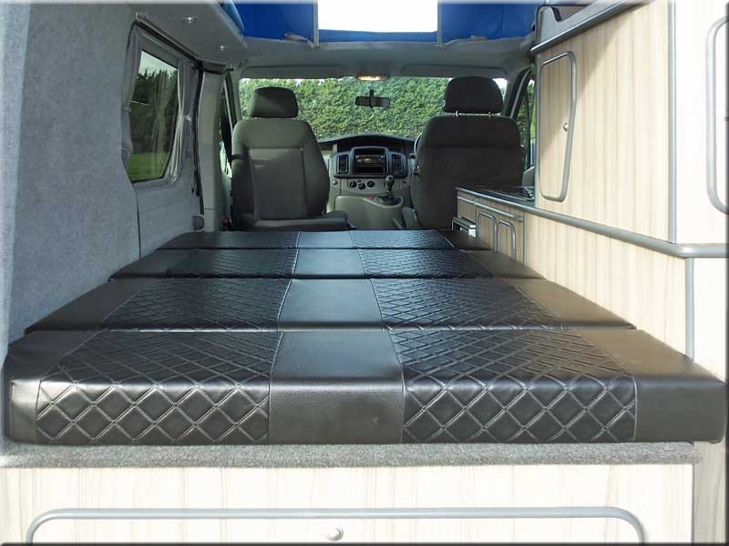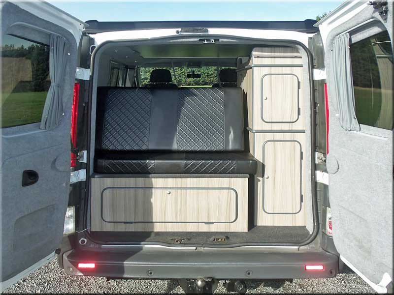 Side and rear access doors & tinted windows, curtains, lino flooring, ample storage, imitiation black leather upholstery.