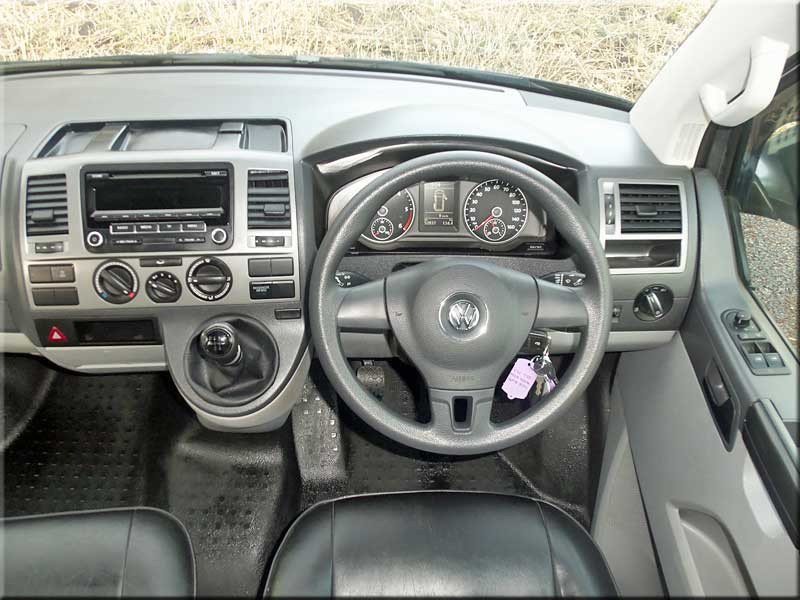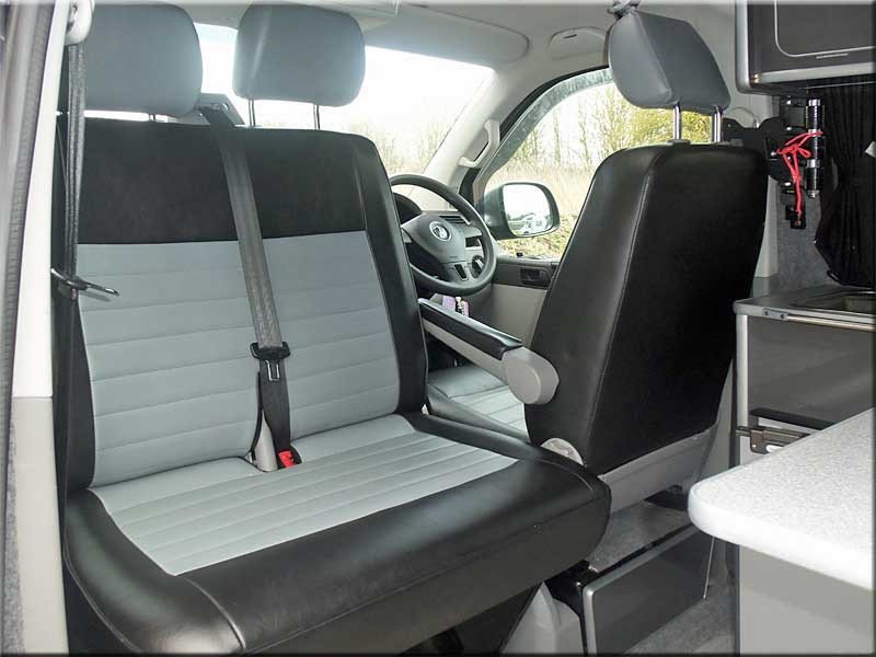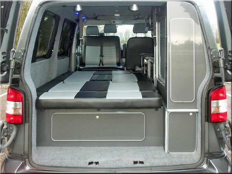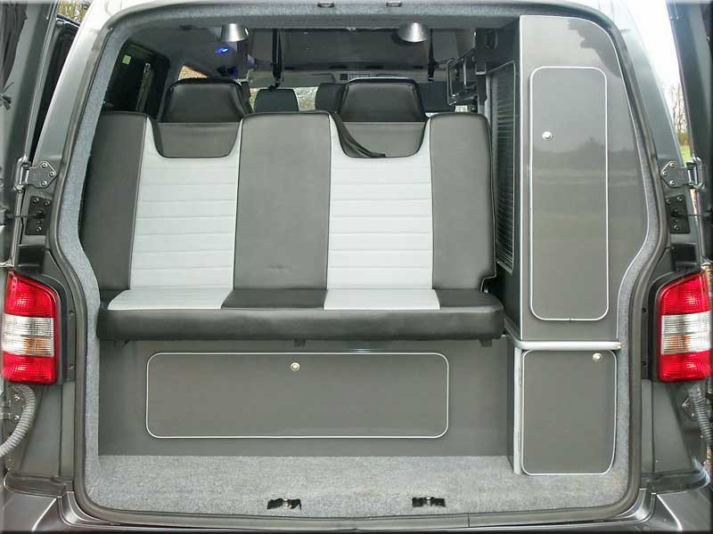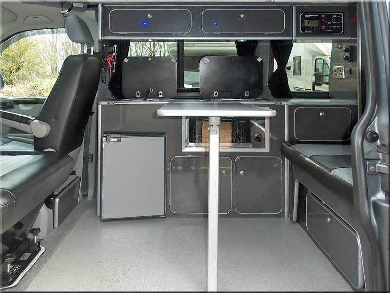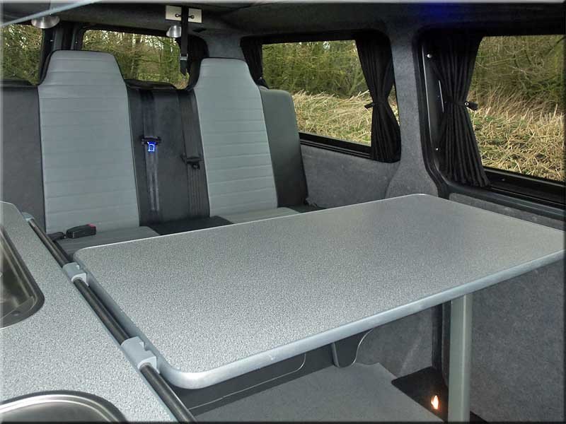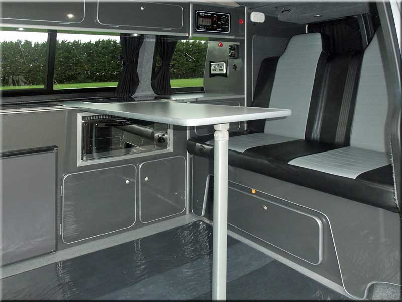 Side and rear access doors, tinted side & rear windows, curtains, lino, ample storage, imitation leather uplholstery (black & grey).