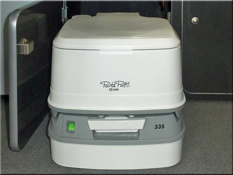 Portable wc (Porta-Potti Qube) in kitchen cabinet.