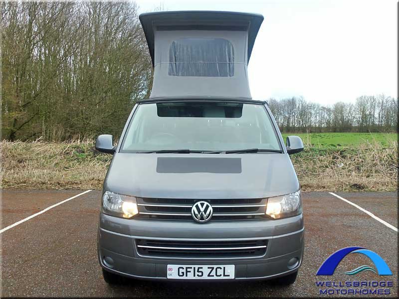A 2+2 berth RHD Manual 2.0TD Hi-Top Camper-Van (2015) with a lift-up roof (manual), PAS, cruise control, alloy wheels, remote central locking. Colour: Grey.