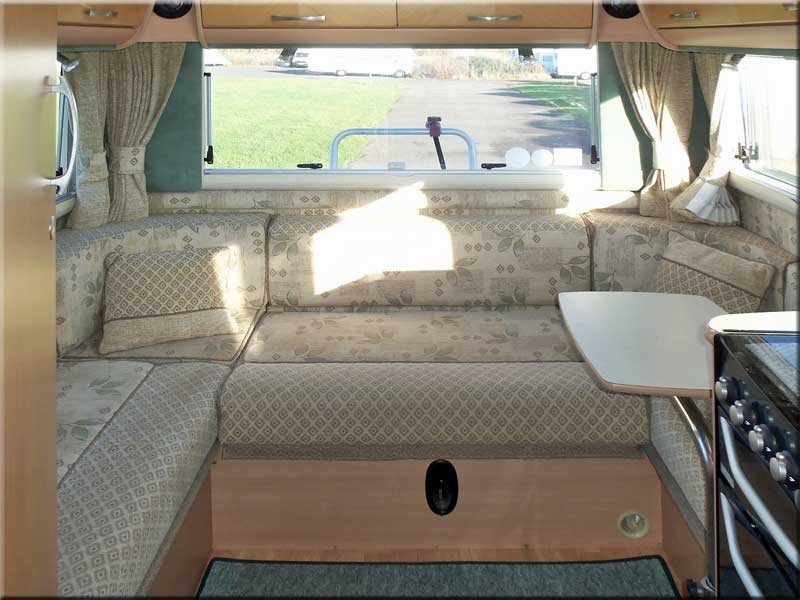 Rear lounge with a U shaped sofa and removable table, plus an occasional table.