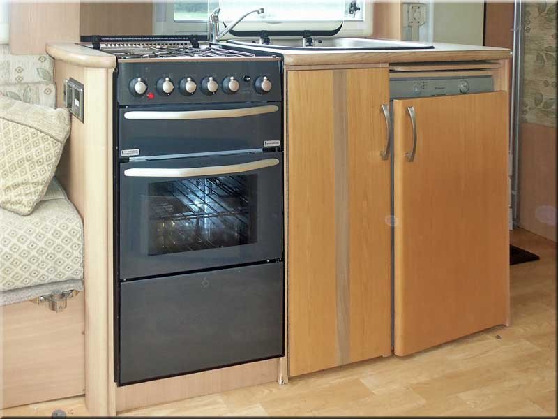Central kitchen with a fully fitted gas cooker with (1 elec & 3 gas hobs), grill and oven, fridge with ice box, sink and drainer, cutlery drawer and cabinets.