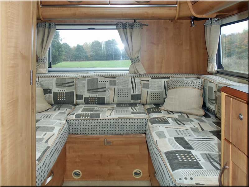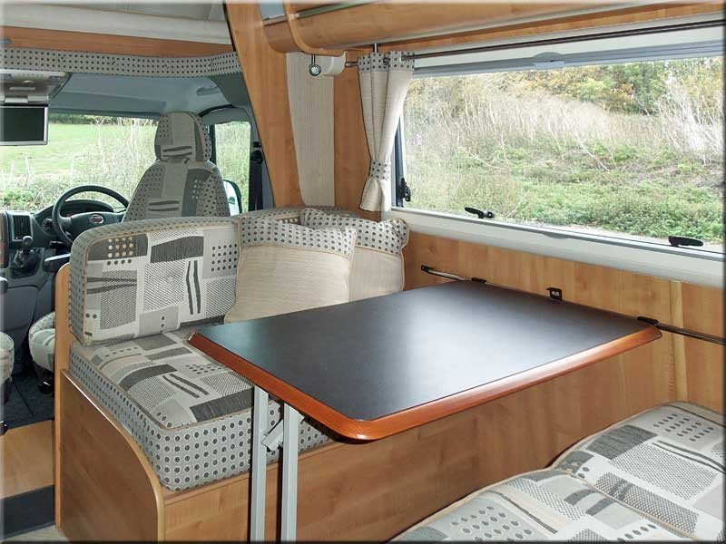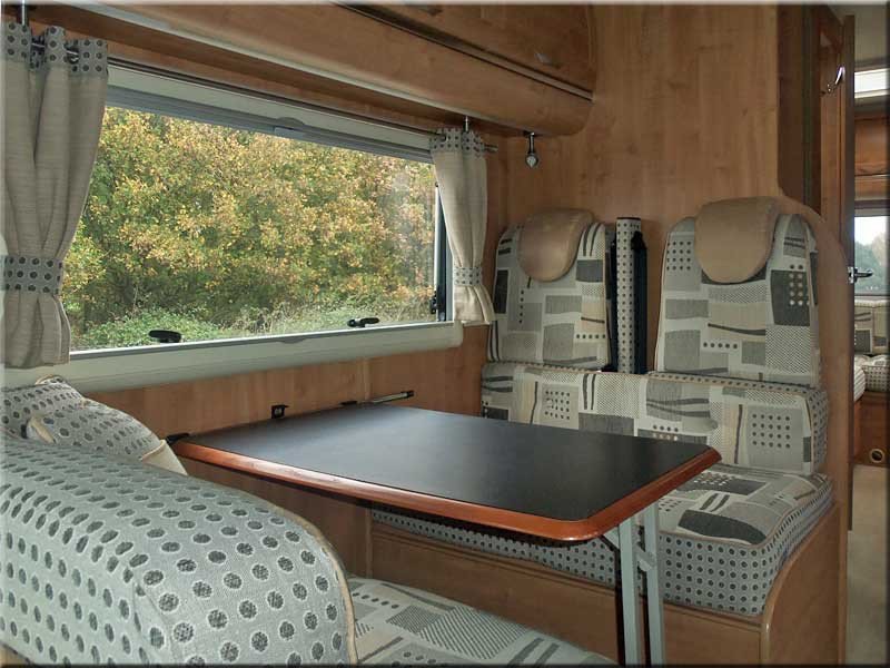 Central dining area with 2 forward facing seats with seat belts, 2 rear facing seats a removable table.