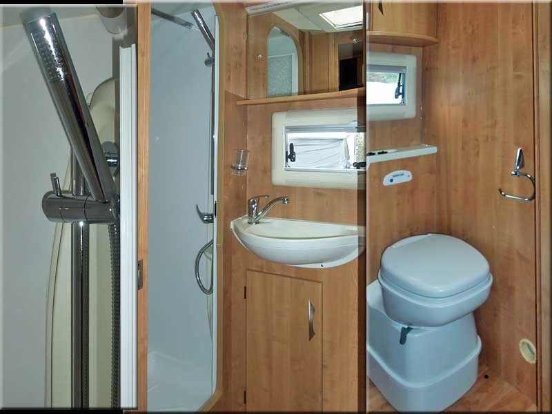 Concertina door to rear. The washroom has a shower cubicle, sink, wc, cabinets & mirror.