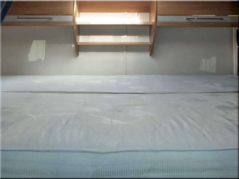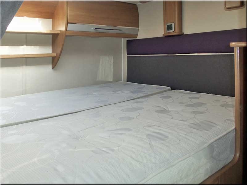 End bedroom with a fixed transverse double bed over the garage & privacy curtain.