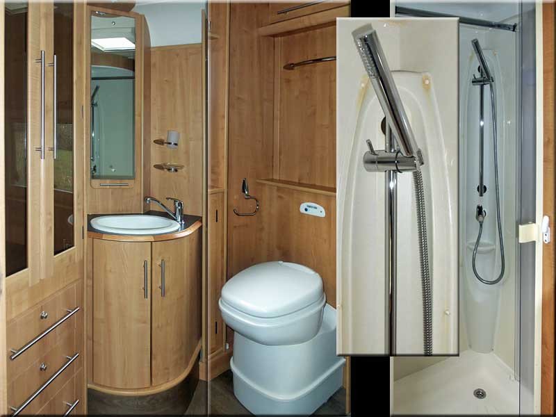 Spacious end/rear washroom with a shower cubicle, sink, wc, cabinet & mirror, mirrored cabinets & shelves, wardrobe.