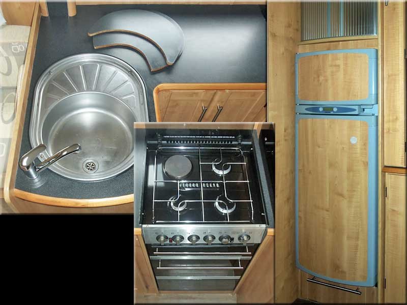 Central/rear kitchen with a fully fitted gas cooker (1 elec & 3 gas hobs), fridge/freezer, sink/drainer, drawers & cabinets, drinks cabinet.