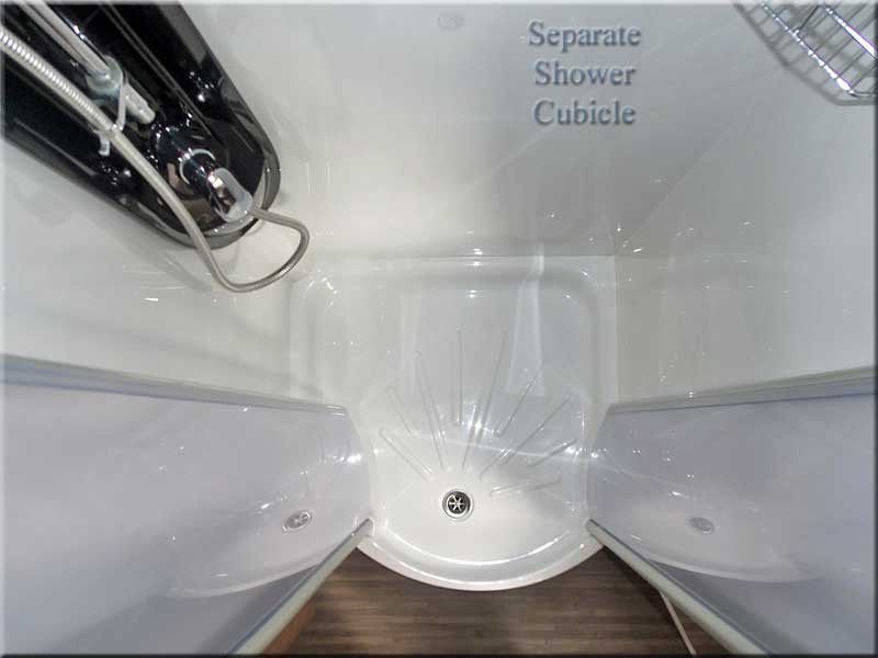 Rear washroom with a sink, wc, cabinets & mirror. Separate shower cubicle.