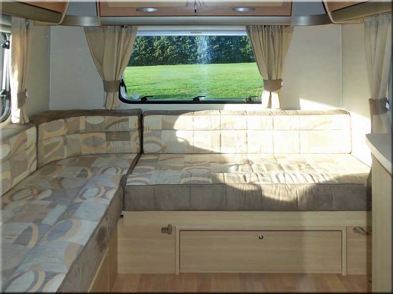 Rear lounge with an L shaped sofa and removable table.