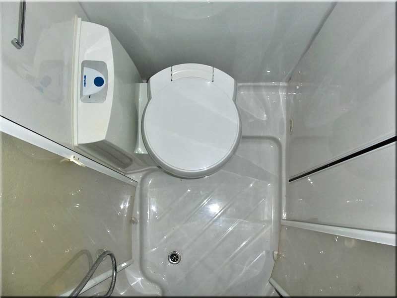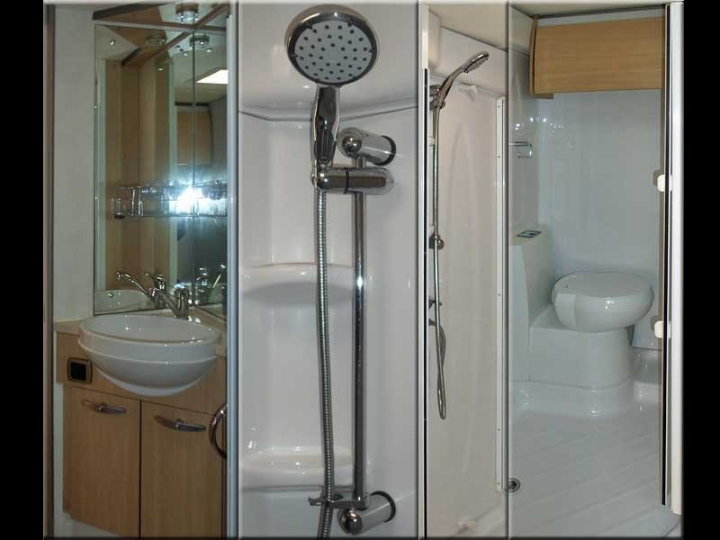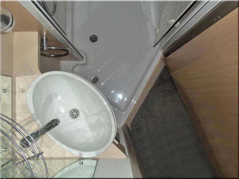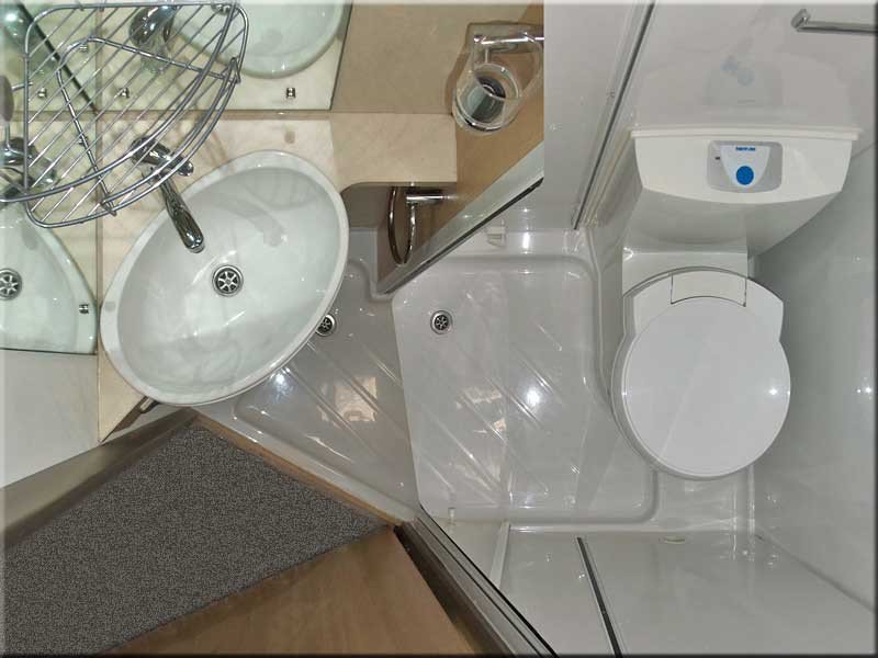 The rear washroom has a shower cubicle, sink, wc, cabinets & mirrors.