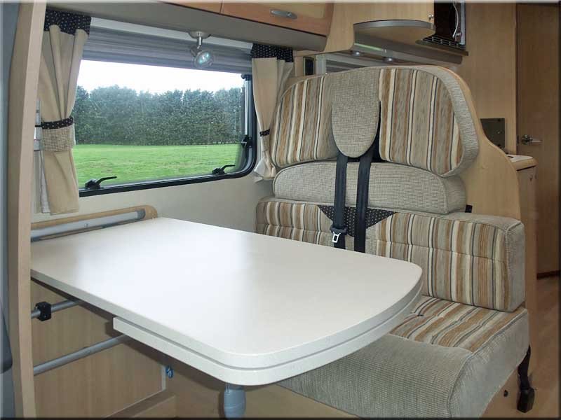 Central dining area with 2 forward facing seats with seat belts & removable table, plus a side facing seat for 2.