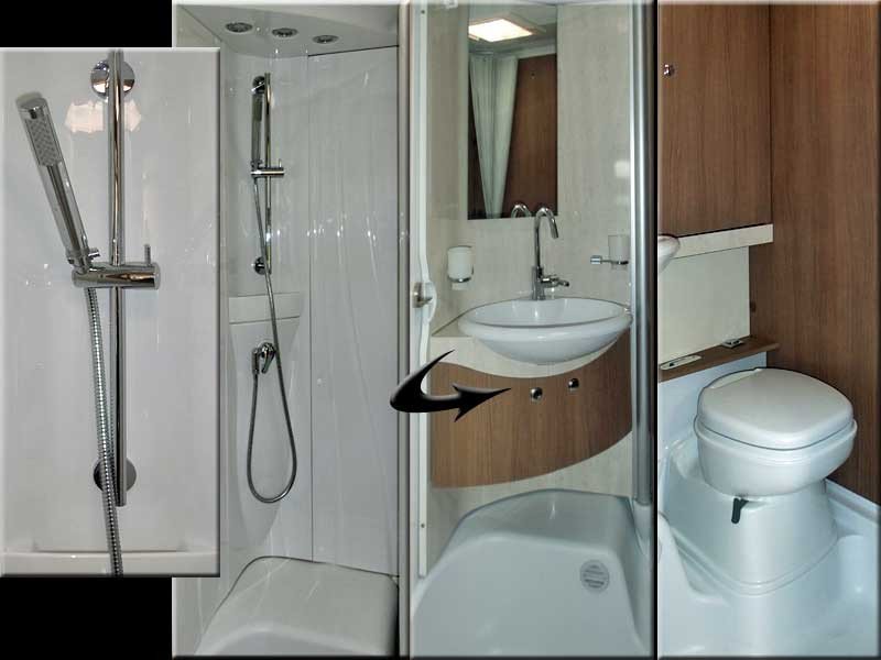 The washroom has a shower behind fold-away wall, sink, wc, cabinets & mirror.