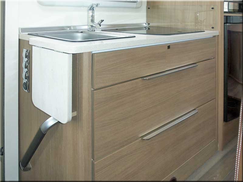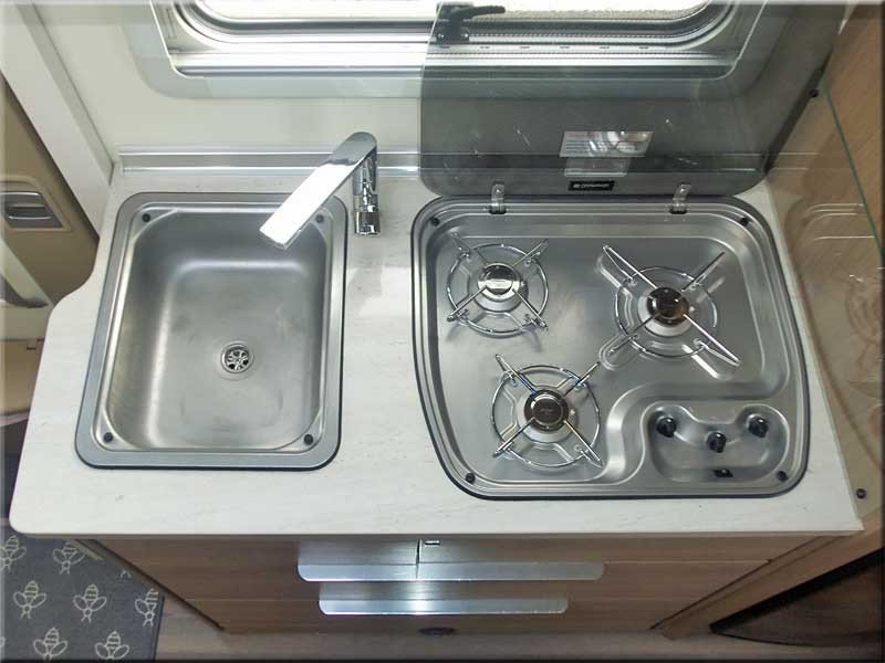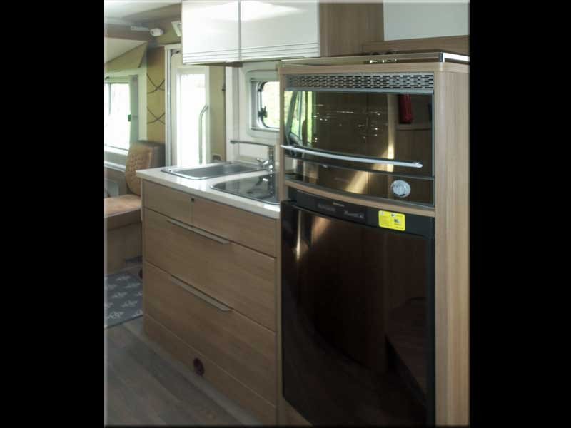 The side kitchen has a surface mounted 3 burner gas hob, oven/grill over the fridge/ice box, sink, drawers & cabinets, cutlery drawer.