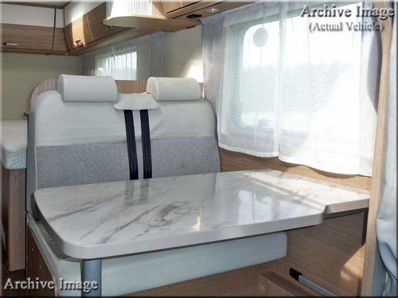 Half dinette with 2 forward facing seats with seat belts and a removable table.