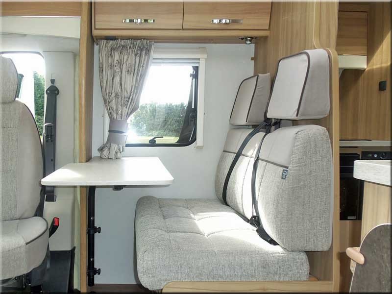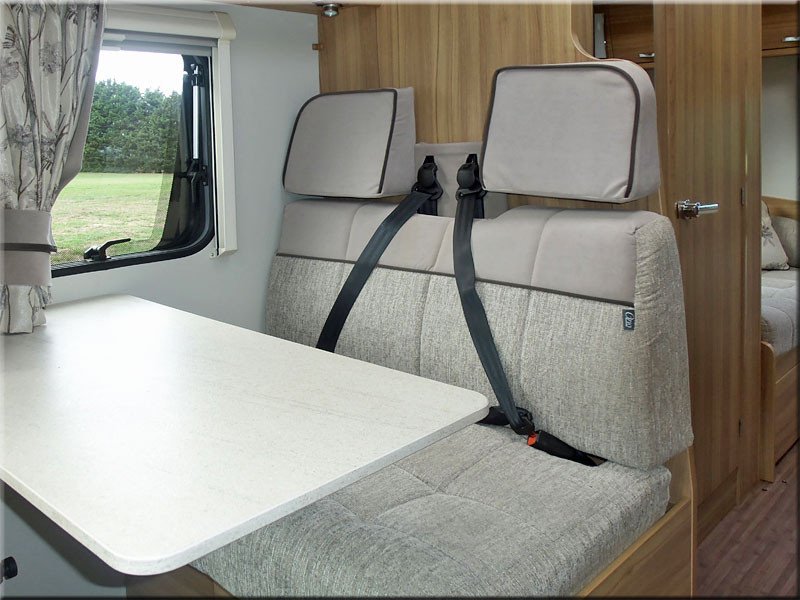 The half dinette has 2 forward facing seats with seat belts and a removable table.