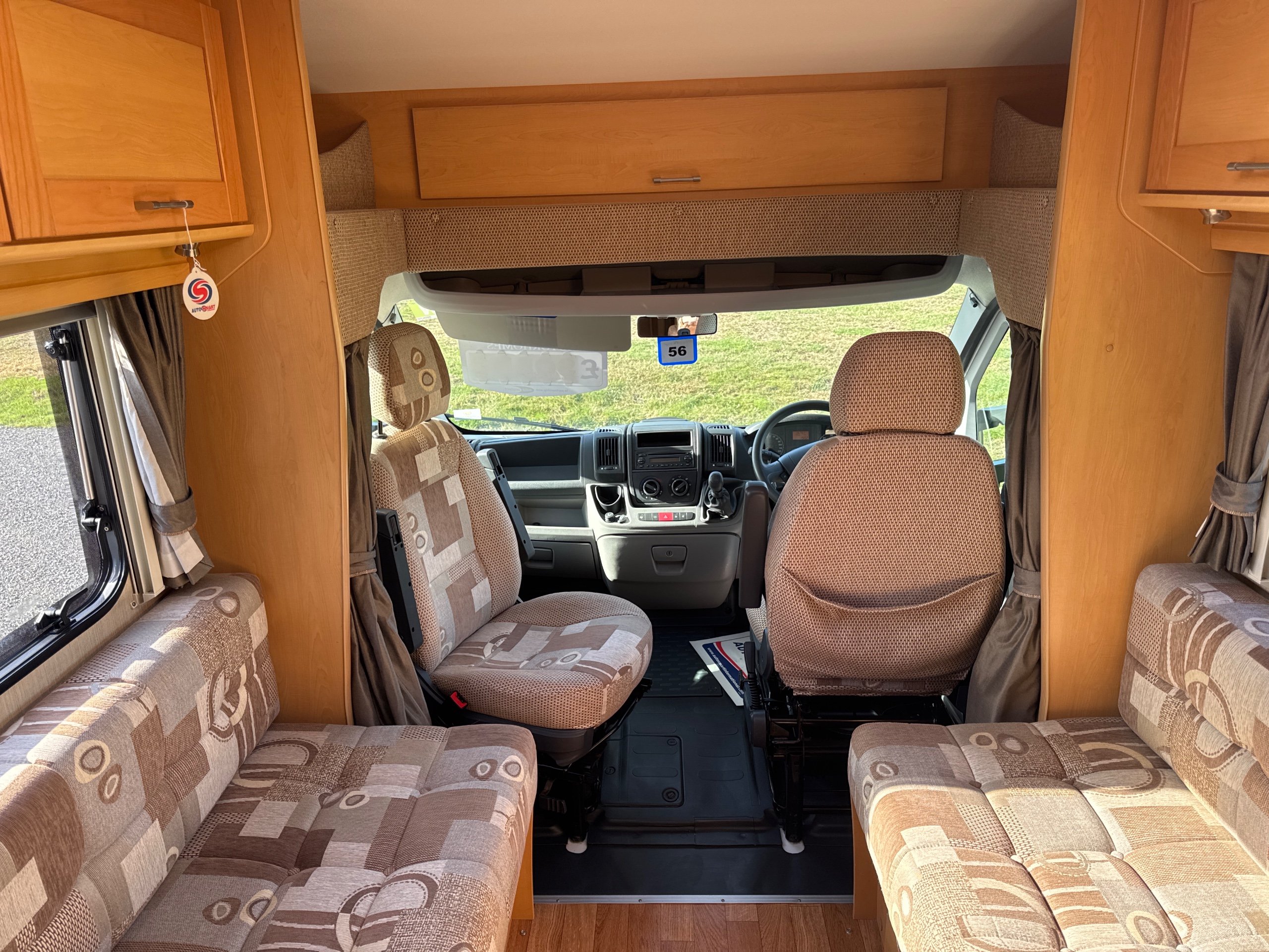 A 4 berth RHD Manual 2.2TD Coach-built Motorhome (2010) with PAS, cruise control, 3.9m awning, Tv aerial, solar panel, tow bar, external security hand rail, remote central locking.