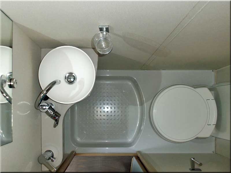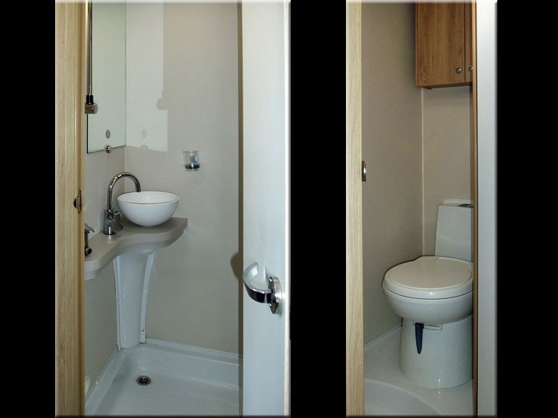 Rear washroom with a shower, sink, wc, cabinet and mirror.