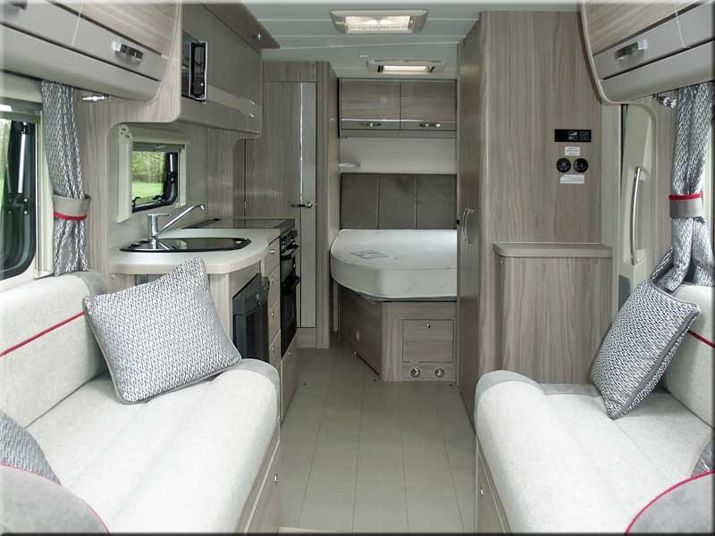 Central lounge/dining area with 2 small side facing sofas & removable table. Plus 2 single fold-away seats with seat belts under the sofas.