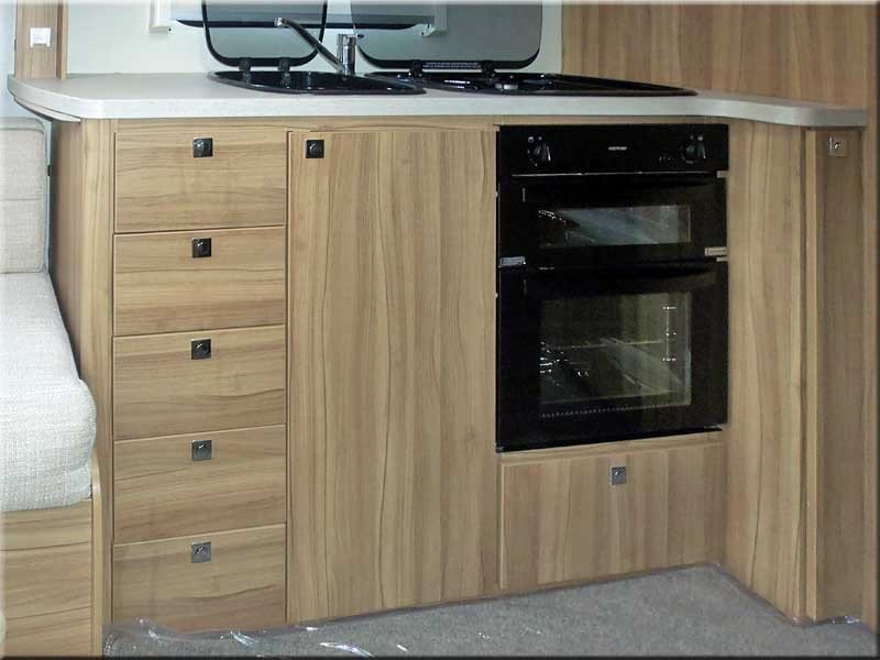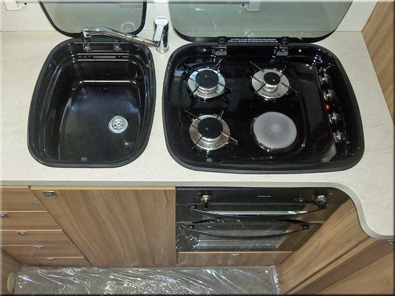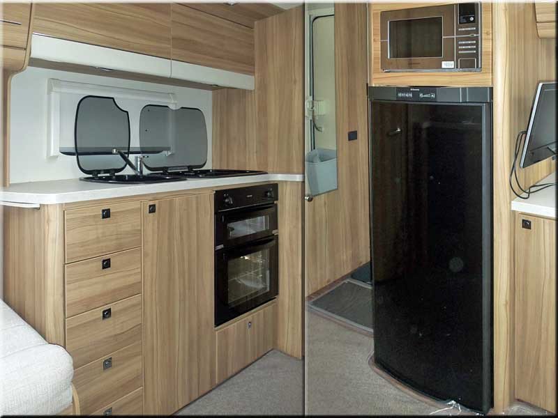The kitchen has a surface mounted sink & hob (1 elec & 3 gas burners), grill & oven, microwave oven over the fridge/freezer, drawers & cabinets.