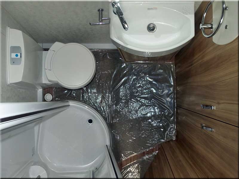 Spacious end/rear washroom with a shower cubicle, sink, wc, cabinets & mirror, large wardrobe.