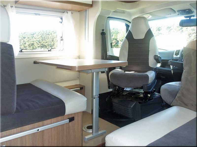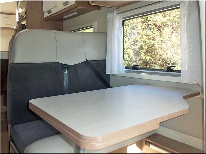 Half dinette with 2 forward facing seats with seat belts and a removable table, a wide side facing single seat.
