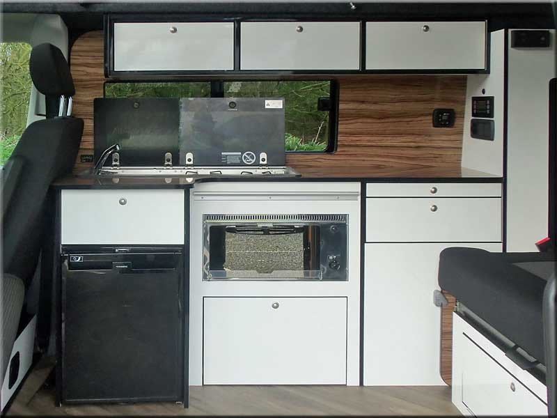 The side kitchen has a surface mounted All-In-1 sink and 2 burner hob, grill, small fridge with ice box, sink, drawers & cabinets.