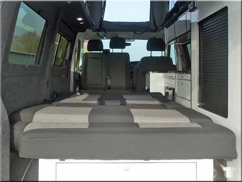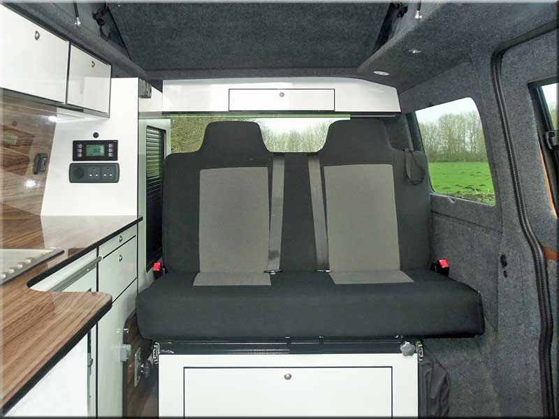 The central area has 2 forward facing seats with seat belts & removable table. Seating converts to a Rock N Roll bed.